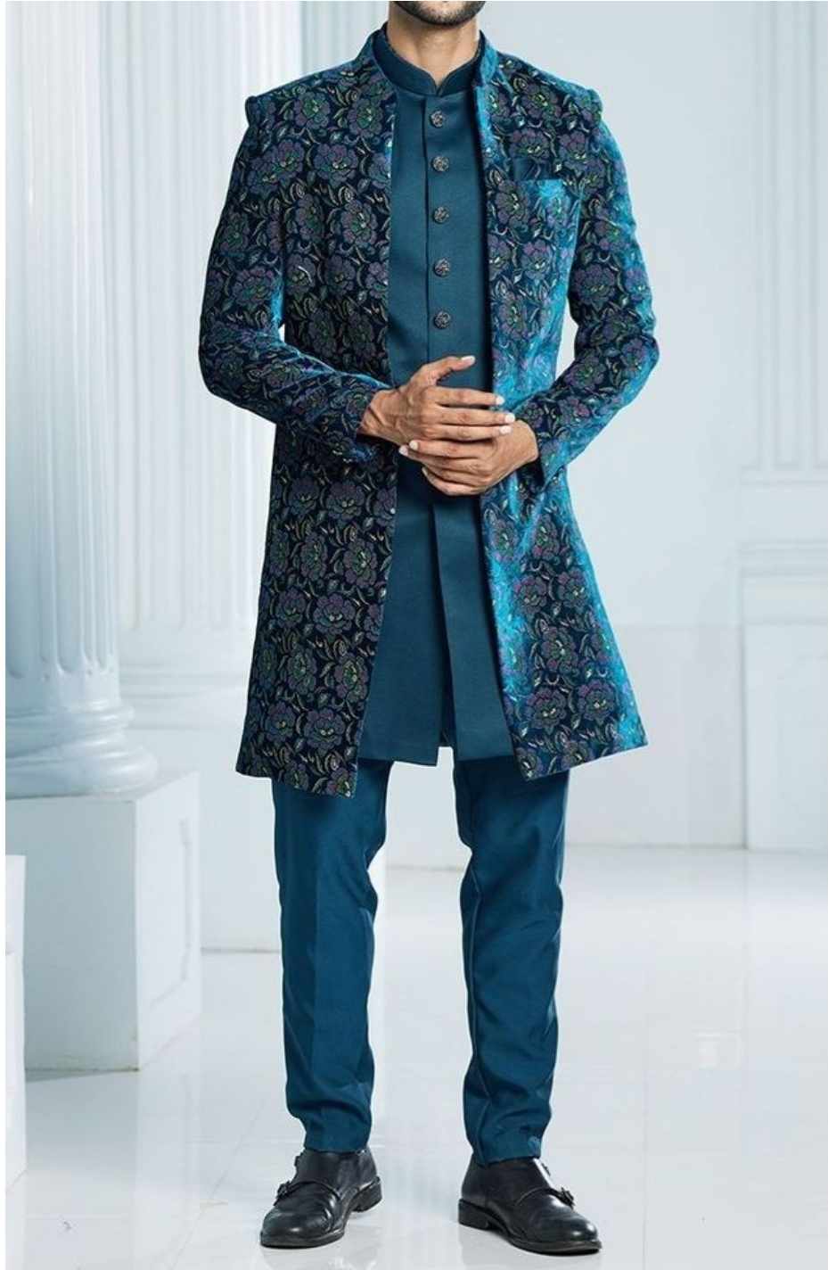 I got up in the morning and got ready, wearing my deep teal sherwani. The intricate patterns on the coat glimmered faintly under the light, catching my attention for a moment. It fit me perfectly, tailored with sharp cuts that gave it a regal look, and the fabric felt rich yet light against my skin. The deep blue hue of the outfit seemed to mirror my moodâcalm on the surface but with ripples of unease beneath. The high collar added a touch of elegance, and as I adjusted the buttons, I caught my reflection in the mirror.