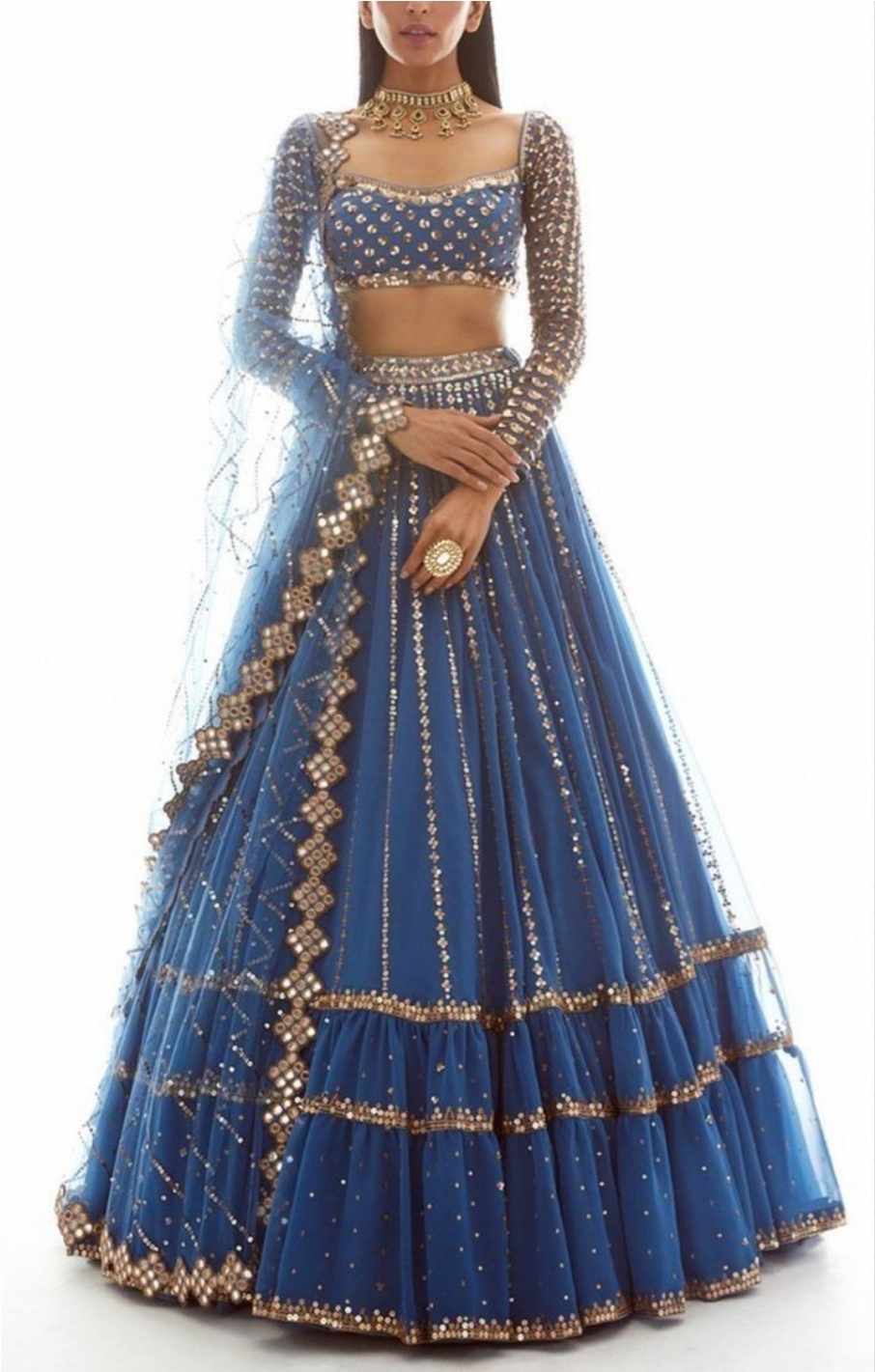 She was wearing a royal blue lehenga that seemed to shimmer with every movement, the intricate mirror work catching the light and scattering tiny reflections around her like stars. The blouse was fitted, with long sleeves adorned in matching mirror embellishments, hugging her arms delicately. The sweetheart neckline subtly framed her collarbones, which were exquisitely defined, as if carved by an artist.