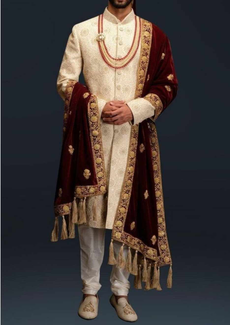 We're entering in the venue with barat. The maroon velvet stole draped over my shoulder feels heavier than it looks, its intricate gold embroidery catching the soft glow of the evening lights. The ivory sherwani, tailored to perfection, clings to me like a second skin, every thread a testament to tradition and grandeur. My fingers instinctively adjust the pearl strings adorning my chest, a regal touch that matches the elegance of the occasion. The handcrafted juttis on my feet carry a quiet dignity, each step deliberate as I lead the barat toward the venue. The air buzzes with music and cheer, yet my focus is unwaveringâsoon, Iâll meet the woman who, against all odds, fate has entwined with mine.
